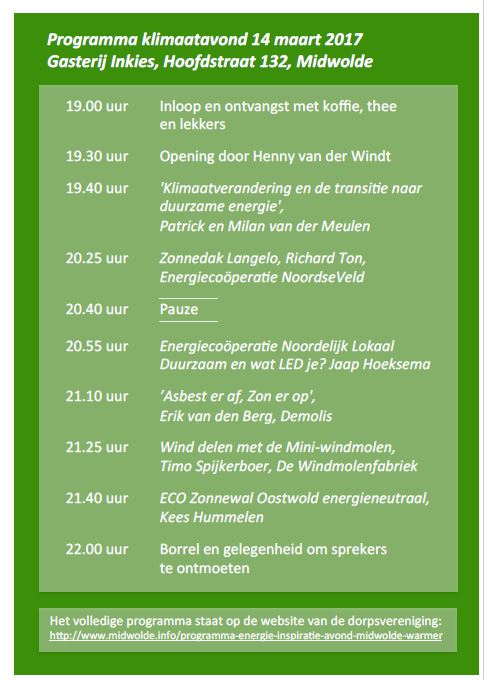 Onderstaand het programma “Wordt Midwolde warmer?” laat verschillende inspirerende voorbeelden van gezamenlijke initiatieven zien.