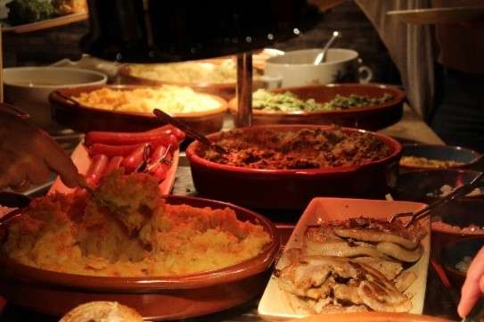 Ondertussen waren Ingrid en haar team bezig om met veel zorg het stamppot buffet voor ons klaar te zetten. Net als voorgaande jaren was er weer een overvloed aan zuurkool, boerenkool en hutspot met speklapjes, worst en het gebruikelijke zuurtje. Onze gastheer Klaas en gastvrouw Ingrid zorgden ervoor dat allen bediend konden worden.