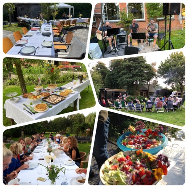 Zes jaren achtereen genoten we bij Trijnie, de Verwoerds, Yvonne en Edwin, Mieke en Lia en de Poelmans van het open huis en tuin met stijlvol gedekte aanschuiftafels. Vers geoogste bloemen, kruiden, groenten, fruit, sappen, soepen, sauzen en smeersels en likeuren uit de natuur. In koppels natuurlijk eten bereiden en daarna samen eten en delen tijdens midzomerse zonsondergangen. Steevast eindigend in een grote kring luisterend, zingend en dansend op de klanken van live muzikanten met drankjes en bonbons rond het kampvuur tot in de late uurtjes.